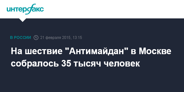 Столичная полиция оценивает количество участников в 35 тыс. человек. "В шествии от улицы Петровка до площади Революции, которое проходит в рамках акции "Антимайдан", принимают участие порядка 35 тысяч человек", - сообщает в субботу сайт ГУ МВД по Москве.