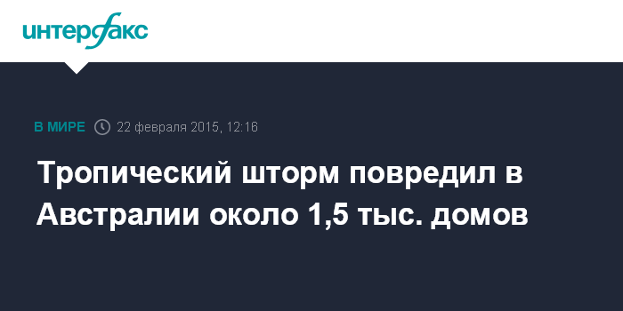 Москва. 22 февраля. INTERFAX.RU - Около 1,5 тыс. домов разрушены или повреждены, тысячи остались без электричества в результате тропического шторма "Марсия" в австралийском штате Квинсленд, сообщили местные власти.