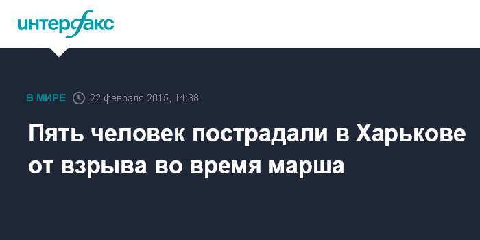 Москва. 22 февраля. INTERFAX.RU - В Харькове от взрыва во время формирования колонны для шествия, по предварительным данным, пострадали пять человек, сообщил "Интерфаксу-Украина" источник в правоохранительных органах.
