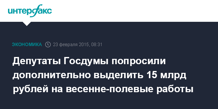 Москва. 23 февраля. INTERFAX.RU - Депутаты фракции "Единая Россия" направили письмо премьер-министру РФ Дмитрию Медведеву с просьбой дополнительно выделить минимум 15 млрд рублей из федерального бюджета на проведение весенне-полевых работ, сообщила пресс-служба зампреда думского комитета по аграрным вопросам Надежды Школкиной.