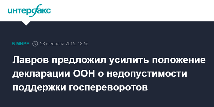 "Предлагаю подумать о подтверждении и усилении соответствующих положений, содержащихся в принятой в 1970 году декларации о принципах международного права, касающихся дружественных отношений и сотрудничества между государствами в соответствии с уставом ООН, с особым упором на недопустимость поддержки антиконституционной смены государственной власти", - сказал глава МИД России Сергей Лавров, выступая на заседании Совбеза ООН в Нью-Йорке.