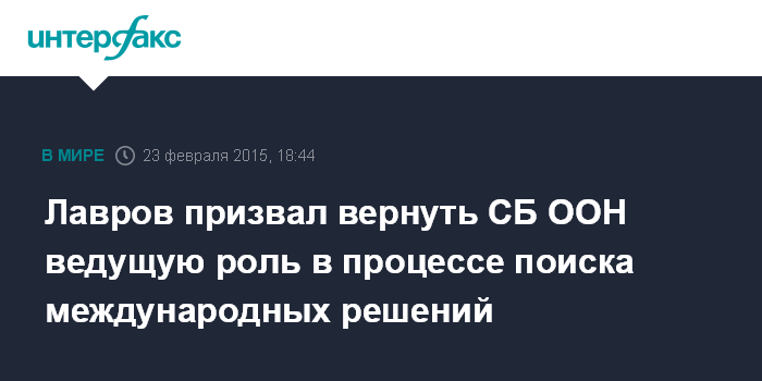 Москва. 23 февраля. INTERFAX.RU - Москва призывает незамедлительно принять меры по возвращению Совету Безопасности ООН роли ведущего органа по согласованию общих подходов в решении мировых проблем, заявил в понедельник глава МИД России Сергей Лавров.