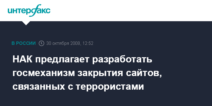 Москва. 30 октября. INTERFAX.RU - Национальный антитеррористический комитет (НАК) предлагает разработать государственный механизм, который позволит закрывать сайты, связанные с террористическими организациями.