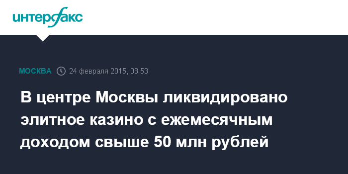 Москва. 24 февраля. INTERFAX.RU - Подпольное казино, ежемесячно приносившее владельцам многомиллионный доход, ликвидировано в элитном доме в историческом центре Москвы, сообщили "Интерфаксу" во вторник в пресс-центре МВД России.