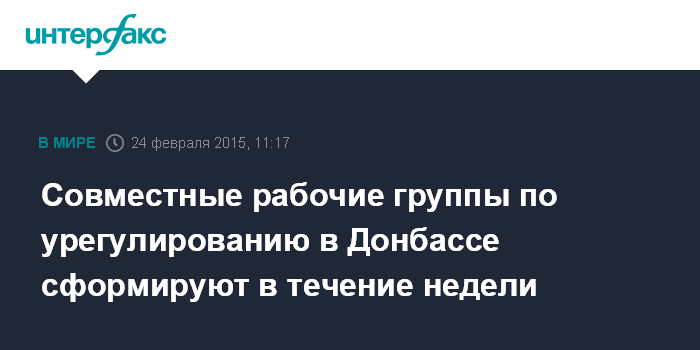Москва. 24 февраля. INTERFAX.RU - Участники мирного процесса на востоке Украины в течение недели могут приступить к формированию рабочих групп по урегулированию отдельных вопросов взаимодействия самопровозглашенных республик и Киева в рамках минских договоренностей, сообщил "Интерфаксу" источник, близкий к переговорному процессу.