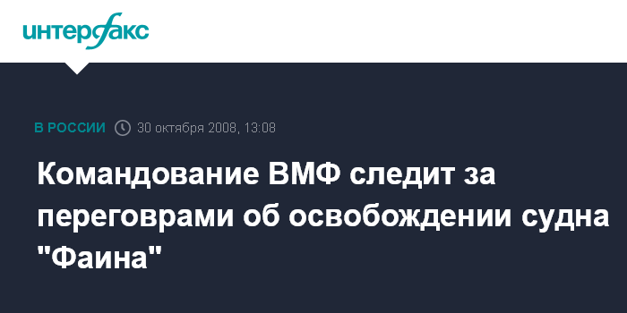 Москва. 30 октября. INTERFAX.RU - Командование Военно-морского флота РФ отслеживает переговорный процесс по освобождению украинского судна "Фаина" захваченного сомалийскими пиратами, сообщил "Интерфаксу-АВН" помощник главкома ВМФ РФ Игорь Дыгало.