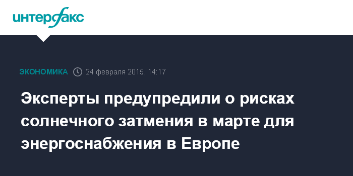 Москва. 24 февраля. INTERFAX.RU - Европейские операторы электросетей предупреждают, что солнечное затмение,ожидаемое в марте 2015 года, способно нарушить энергоснабжение в регионе, все более активно использующем солнечную энергию, пишет газета Financial Times.
