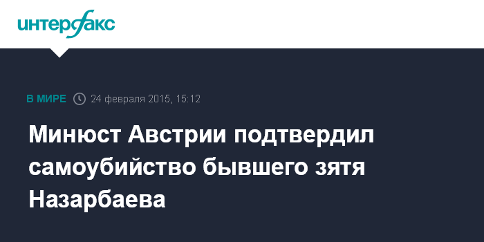 Москва. 24 февраля. INTERFAX.RU - Министерство юстиции Австрии официально устно подтвердило факт суицида бывшего зятя Нурсултана Назарбаева, гражданина Казахстана Рахата Алиева, сообщила пресс-служба МИД Казахстана.