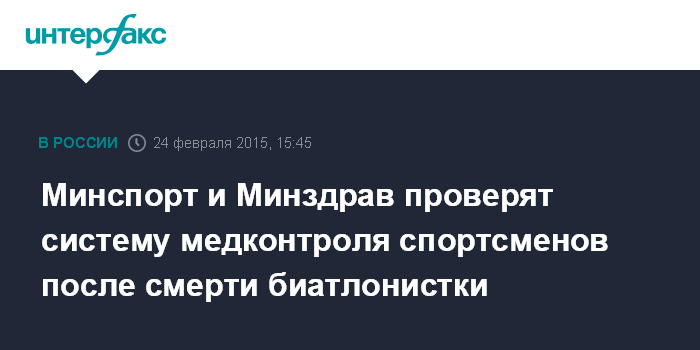 Москва. 24 февраля. INTERFAX.RU - Минспорт России совместно с Минздравом проведут проверку системы медицинского контроля спортсменов в Удмуртии после смерти биатлонистки Алины Якиминой во время гонки, сообщается на сайте Минспорта со ссылкой на министра Виталия Мутко.