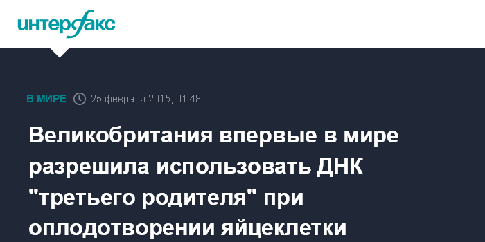 Москва. 25 февраля. INTERFAX.RU - В Великобритании впервые в мире приняли закон, позволяющий использовать ДНК третьего человека при экстракорпоральном оплодотворении человеческой яйцеклетки, сообщила BBC News.