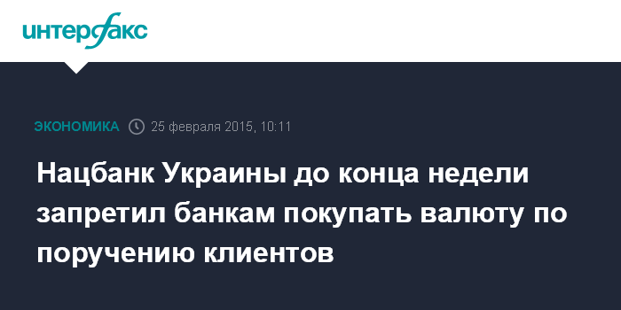 Москва. 25 февраля. INTERFAX.RU - Нацбанк Украины в условиях обвального падения гривны прибег к новым административным ограничениям, запретив уполномоченным банкам осуществлять покупку иностранной валюты по поручению клиентов (в том числе по заявлениям, которые были поданы до 25 февраля) до 27 февраля 2015 включительно.