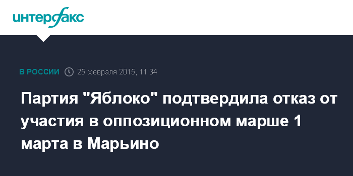 Москва. 25 февраля. INTERFAX.RU - Партия "Яблоко" не будет участвовать в оппозиционном марше "Весна", который запланирован на 1 марта, скорее всего, проведет в этот день серию одиночных пикетов.