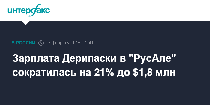 Москва. 25 февраля. INTERFAX.RU - Зарплата президента ОК "РусАл" Олега Дерипаски по итогам прошлого года снизилась на 21% по сравнению с 2013 годом, до $1,761 млн, следует из отчета компании.