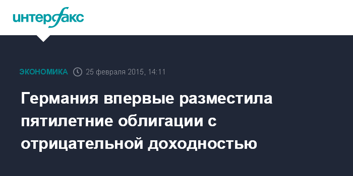 Москва. 25 февраля. INTERFAX.RU – Германия продала пятилетние облигации на 3,28 млрд с отрицательной доходностью, что отмечено впервые для бумаг с таким сроком обращения.