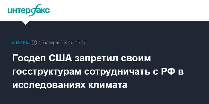 Москва. 25 февраля. INTERFAX.RU - Государственный департамент США запретил американскому Национальному управлению океанических и атмосферных явлений (NOAA) сотрудничать с российскими метеорологами по климатическим исследованиям, заявил глава Росгидромета Александр Фролов.