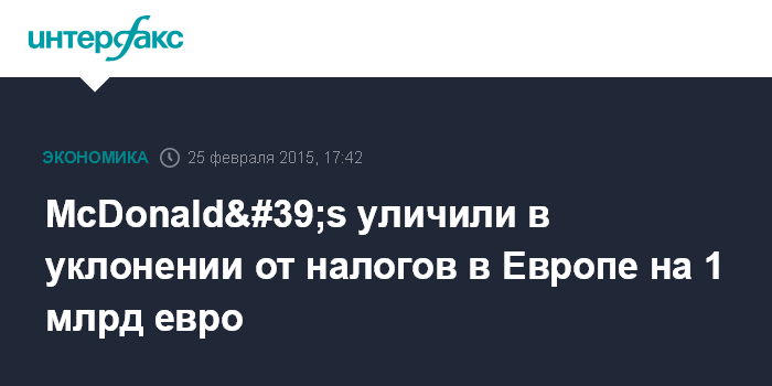 Москва. 25 февраля. INTERFAX.RU - Американская McDonald's Corp., которой принадлежит крупнейшая в мире сеть заведений быстрого питания, умышленно избегала выплаты налогов в Европе, перенаправляя доходы в дочернее подразделение в Люксембурге, сообщается в заявлении профсоюзов США и Европы и британской группы активистов War on Want.
