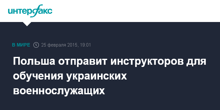 Москва. 25 февраля. INTERFAX.RU - Несколько десятков польских военнослужащих отправятся на Украину для обучения младшего офицерского состава, сообщил в среду польский телеканал ТВН24 со ссылкой на представителя министра обороны Польши и руководителя учебных программ Богуслава Пацека.
