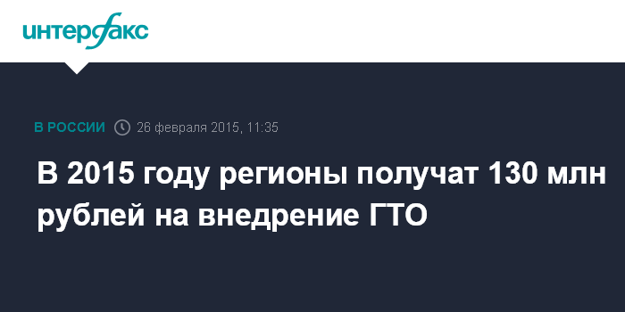 Москва. 26 февраля. INTERFAX.RU - Регионы получат в 2015 году порядка 130 млн рублей на создание пунктов тестирования на нормы ГТО, сообщил глава российского правительства Дмитрий Медведев.