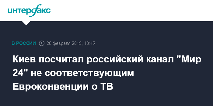 Москва. 26 февраля. INTERFAX.RU - Национальный совет Украины по вопросам телевидения и радиовещания решил, что российский телеканал "Мир 24" не соответствует требованиям украинского законодательства и Европейской конвенции о трансграничном телевидении, сообщил регулятор на официальной странице в соцсети Facebook в четверг.