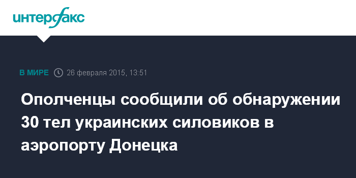 Москва. 26 февраля. INTERFAX.RU - При разборе завалов донецкого аэропорта спасателями обнаружено не менее 30 тел украинских солдат, сообщили в четверг министерстве обороны Донецкой народной республики.
