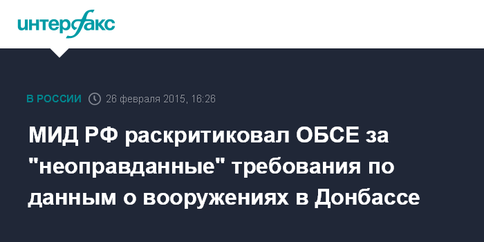 Москва. 26 февраля. INTERFAX.RU - Российский МИД выразил свое беспокойство в связи с неоправданными требованиями специальной мониторинговой миссии ОБСЕ на Украине предоставить полную информацию о местах нахождения тяжелых вооружений и маршрутах их отвода на востоке страны.