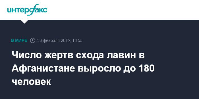 Москва. 26 февраля. INTERFAX.RU - Жертвами схода снежных лавин, вызванных обильными снегопадами, на северо-востоке Афганистана стали по меньшей мере 180 человек, сообщает в четверг британский телеканал Sky news.