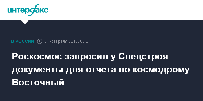 Москва. 27 февраля. INTERFAX.RU - Федеральное космическое агентство (Роскосмос) запросило у Федерального агентства по специальному строительству (Спецстрой) РФ документы для подготовки "объективного отчета" о состоянии строительства космодрома Восточный. Об этом пишет "Коммерсант" со ссылкой на письмо заместителя руководителя ведомства Владимира Иванова директору Спецстроя Александру Волосову.