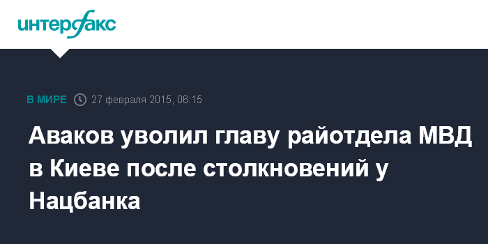 Москва. 27 февраля. INTERFAX.RU - По итогам "беглого разбирательства" глава МВД Украины Арсен Аваков решил уволить руководителя Печерского райотдела милиции Киева, его заместитель по общественной безопасности - отстранен до выводов комиссии по расследованию. Об этом министр написал в своем фейсбуке.