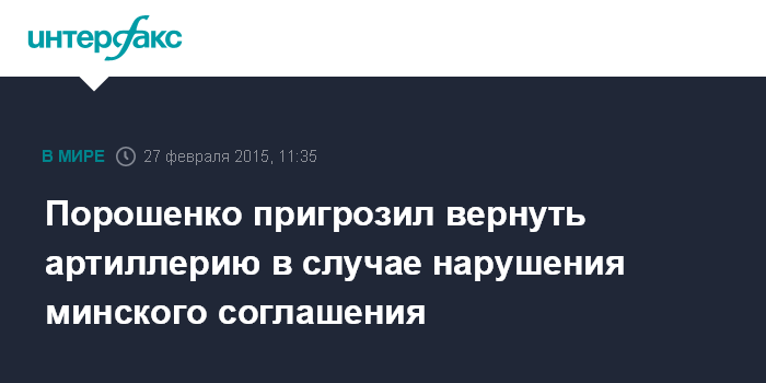 Москва. 27 февраля. INTERFAX.RU - Президент Украины Петр Порошенко заявил, что украинские военнослужащие готовы вернуть тяжелую технику на прежние рубежи в Донбассе в случае невыполнения минских договоренностей противником.