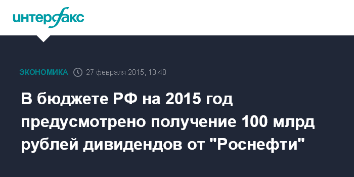 Москва. 27 февраля. INTERFAX.RU - В бюджете РФ на 2015 год предусмотрено получение 100 млрд рублей дивидендов от "Роснефти", заявила заместитель министра финансов Татьяна Нестеренко журналистам в пятницу.