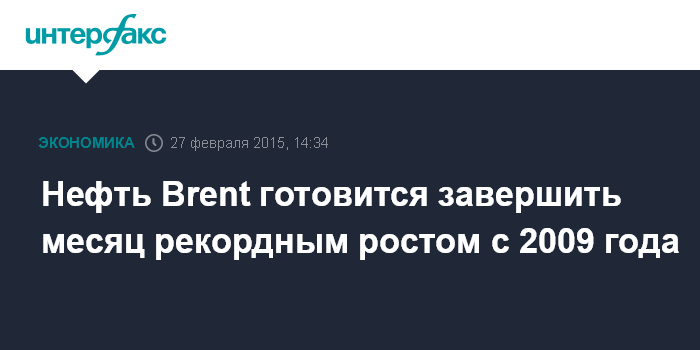 Москва. 27 февраля. INTERFAX.RU – Нефть эталонных марок дорожает в пятницу, причем Brent по итогам февраля может продемонстрировать рекордный месячный рост за почти шесть лет, сообщило агентство Bloomberg.