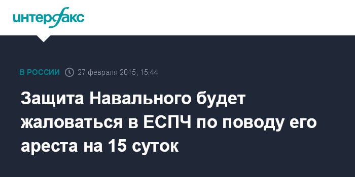 Москва. 27 февраля. INTERFAX.RU - Защита оппозиционера Алексей Навального намерена направить в Европейский суд по правам человека (ЕСПЧ) жалобу в связи с его административным арестом на 15 суток по делу о повторном нарушении законодательства о митингах.