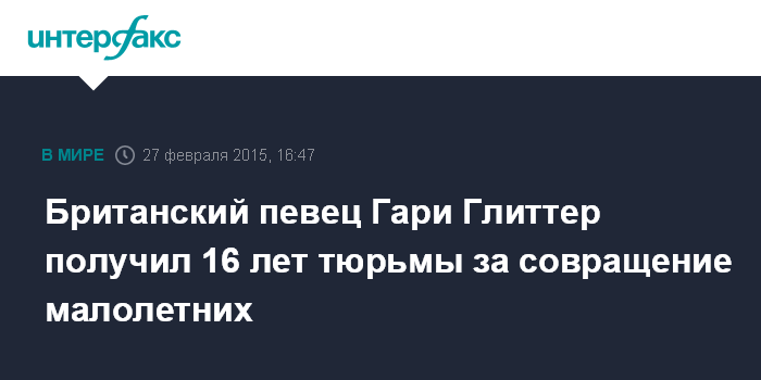 Москва. 27 февраля. INTERFAX.RU - Лондонский суд приговорил британского поп-музыканта Гари Глиттера (настоящее имя Пол Фрэнсис Гэдд) к 16 годам тюрьмы за совращение малолетних, сообщает BBC News.