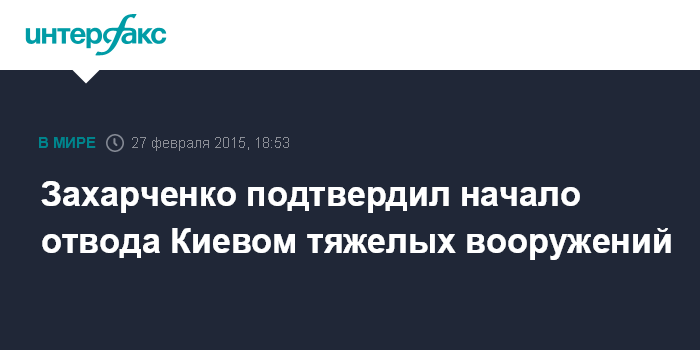 Москва. 27 февраля. INTERFAX.RU - Глава самопровозглашенной Донецкой народной республики Александр Захарченко подтвердил начало отвода тяжелых вооружений украинской армии от линии соприкосновения в Донбассе.