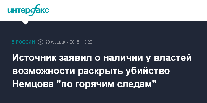 Москва. 28 февраля. INTERFAX.RU - У правоохранительных органов есть все шансы раскрыть убийство оппозиционера Бориса Немцова "по горячим следам", сообщил "Интерфаксу" источник, знакомый с ходом расследования.