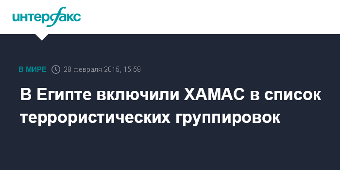 Москва. 28 февраля. INTERFAX.RU - Судебные власти Египта решили включить палестинское движение ХАМАС, контролирующее сектор Газа, в список террористических группировок, сообщает в субботу египетское государственное телевидение.