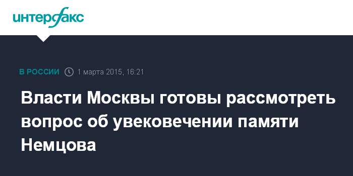 "Если обращение об увековечении памяти Немцова, в частности об установке памятного знака на месте его гибели, поступит, оно будет рассмотрено", - сказал он "Интерфаксу" в воскресенье.