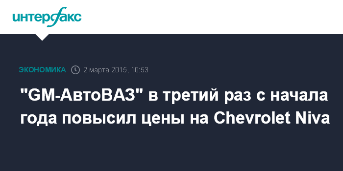 Москва. 2 марта. INTERFAX.RU – "GM-АвтоВАЗ" (совместное предприятие "АвтоВАЗа" и General Motors в Тольятти) с 1 марта повысил цены на Chevrolet Niva всех комплектаций, сообщили "Интерфаксу" в пресс-службе предприятия.