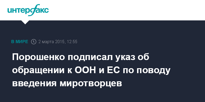 Москва. 2 марта. INTERFAX.RU - Президент Украины Петр Порошенко ввел в действие решение Совета национальной безопасности и обороны Украины (СНБО) от 18 февраля "Об обращении к Организации объединенных наций и Европейскому Союзу о развертывании на территории Украины международной операции по поддержанию мира и безопасности".