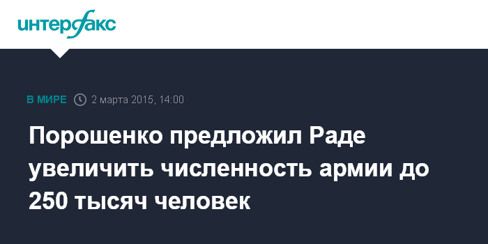 Москва. 2 марта. INTERFAX.RU - Президент Украины Петр Порошенко внес в Верховную раду проект закона о численности вооруженных сил, в соответствии с которым их предельная численность увеличивается до 250 тыс человек, в том числе 204 тысяч военнослужащих.