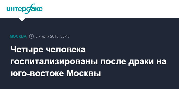 Москва. 2 марта. INTERFAX.RU - Четыре человека госпитализированы с побоями после драки на юго-востоке Москвы, сообщили "Интерфаксу" в пресс-службе столичного главка полиции.