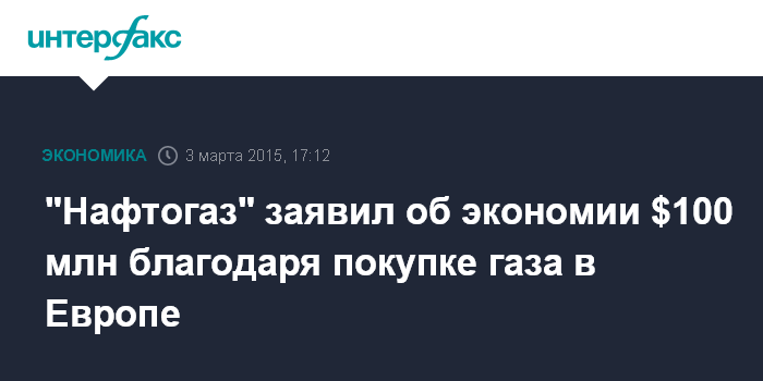 Москва. 3 марта. INTERFAX.RU - НАК "Нафтогаз Украины" в феврале 2015 года сэкономил $100 млн на разнице между ценой газа, купленного в Европе, и предлагаемой "Газпромом" ценой, сообщил директор по развитию бизнеса НАК "Нафтогаз Украины" Юрий Витренко.