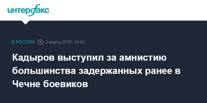 "Будь моя воля, я бы большинство задержанных в предыдущие годы, освободил бы. Потому что у нас была сложная военная ситуация. (…) Если бы на то была моя воля, то я амнистировал тех людей, которые в тяжелые времена нашего региона взяли в руки оружие", - заявил Кадыров во вторник "Интерфаксу".