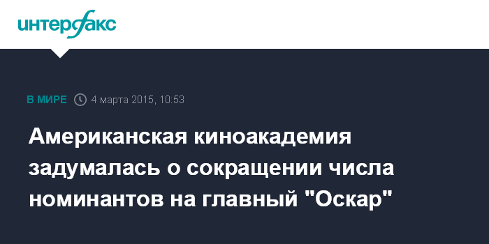 Москва. 4 марта. INTERFAX.RU - Американская академия кинематографических искусств и наук рассматривает возможность вернуться к практике номинации пяти картин на премию "Оскар" в категории "Лучший фильм", пишет The Hollywood Reporter со ссылкой на собственные источники.