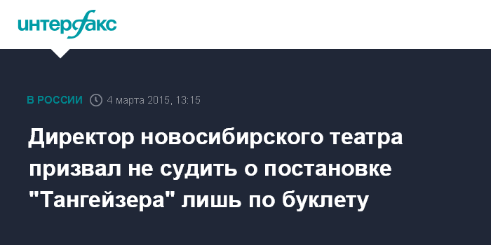 Москва. 4 марта. INTERFAX.RU - Представителям прокуратуры, возбудившим административное дело по поводу постановки оперы Рихарда Вагнера "Тангейзер" в Новосибирском государственном академическом театре оперы и балета (НГАТОиБ), следует посмотреть спектакль целиком. Об этом после заседания суда заявил директор НГАТОиБ Борис Мездрич.