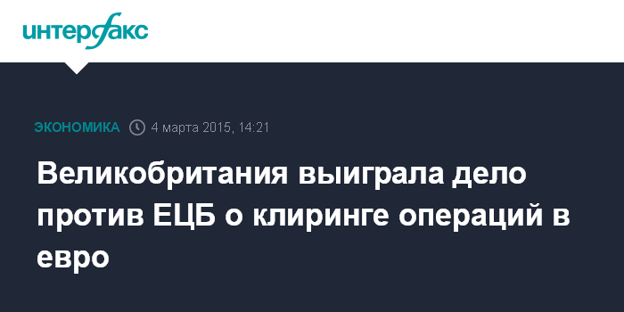 Москва. 4 марта. INTERFAX.RU – Требование Европейского центрального банка к британским компаниям, которые осуществляют клиринг торговых операций в евро, о переносе их деятельности в еврозону будет аннулировано, постановил Общий суд ЕС.