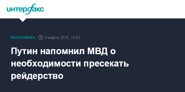 Москва. 4 марта. INTERFAX.RU – Президент России Владимир Путин на коллегии МВД заявил о необходимости пресечения рейдерства. Для формирования благоприятного предпринимательского климата в стране необходима надежная гарантия прав собственности, подчеркнул он.
