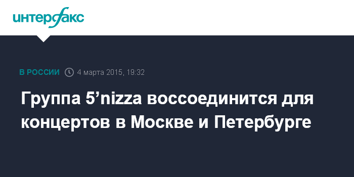 Москва. 4 марта. INTERFAX.RU - Украинская группа 5"nizza, распавшаяся в 2007 году, воссоединится на два концерта в Москве и Санкт-Петербурге. Об этом сообщает "Медуза" со ссылкой на организатора выступлений компанию "Апельсин Концерт".