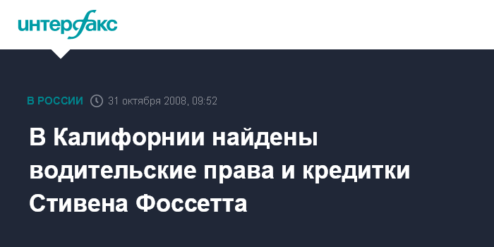 Лос-Анджелес. 31 октября. INTERFAX.RU - Водительские права и кредитные карточки известного путешественника Стивена Фоссетта, обнаружены в американском штате Калифорния, примерно в 800 м от места падения его самолета, сообщает газета Los Angeles Times.