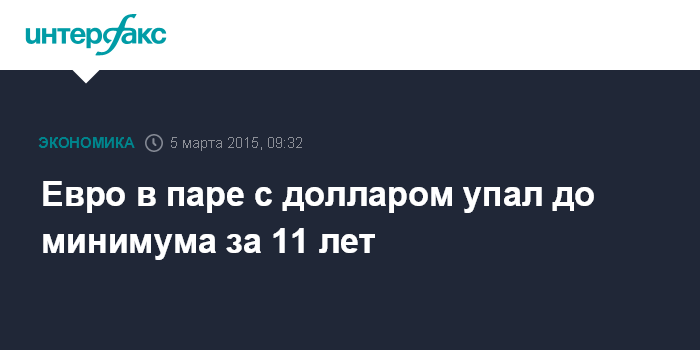 Москва. 5 марта. INTERFAX.RU – Евро в ходе торгов в четверг упал до минимума с сентября 2003 года в паре с долларом в ожидании заседания Европейского центрального банка и запуска программы количественного смягчения (QE) в еврозоне, сообщает агентство Bloomberg.